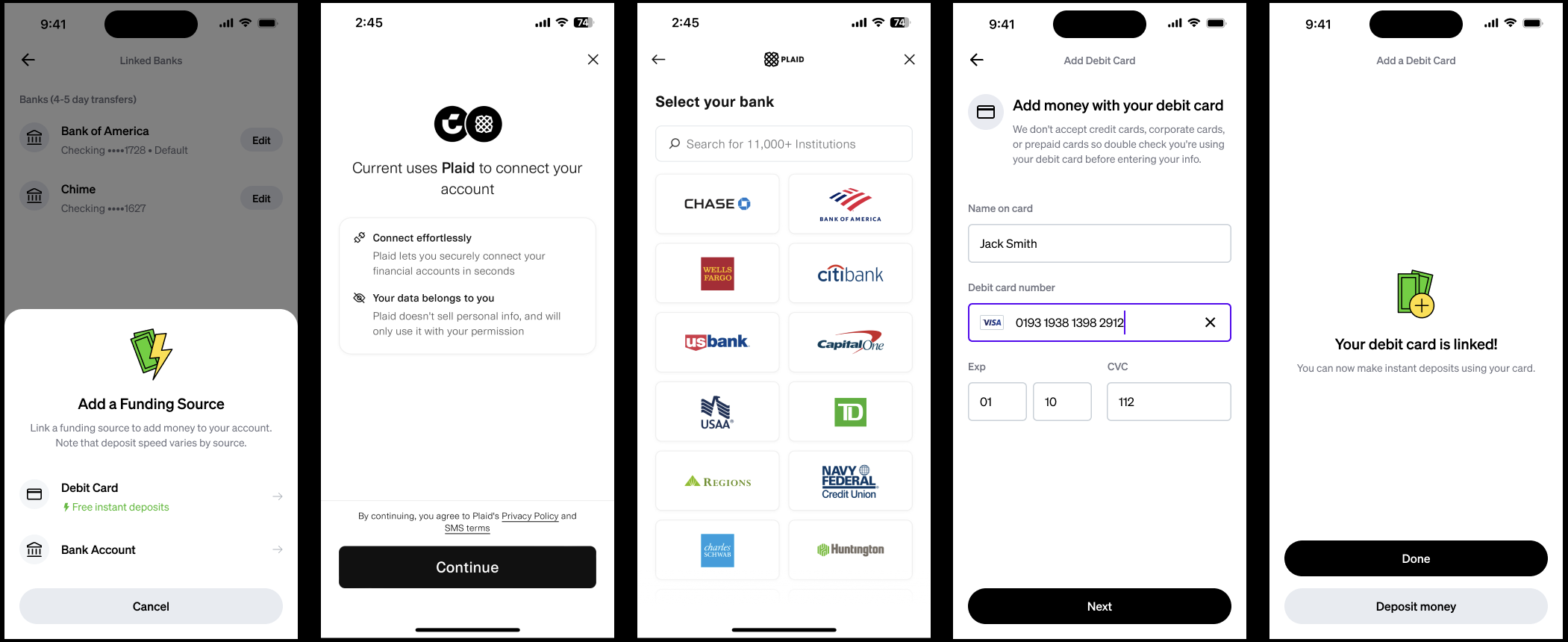 Ability to fund the user's checking account by linking funding sources including external banks and debit cards.