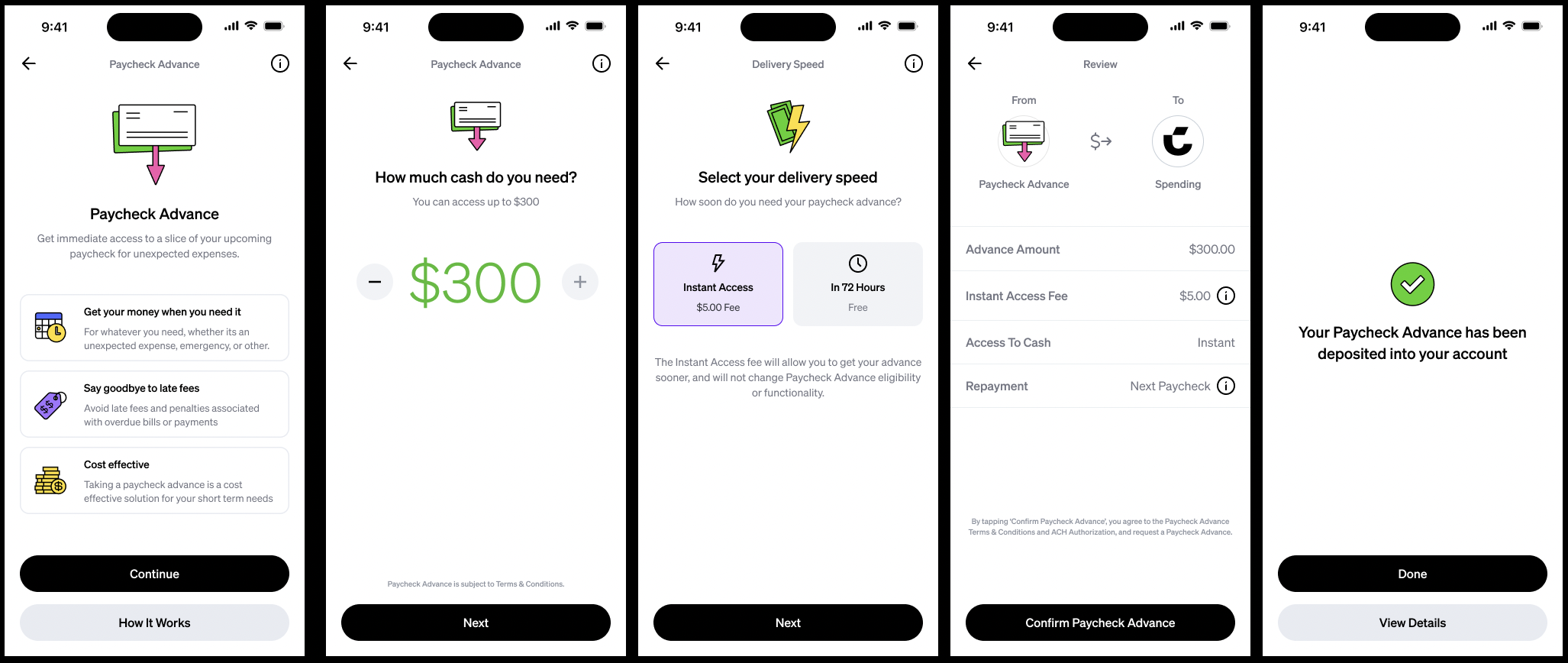 Access to cash advances on future paychecks based on a user's qualified direct deposit history.