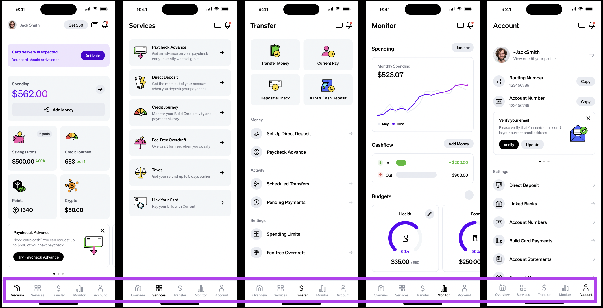 - Services - access to product features (Paycheck Advance, Credit Journey, Overdraft, Taxes)